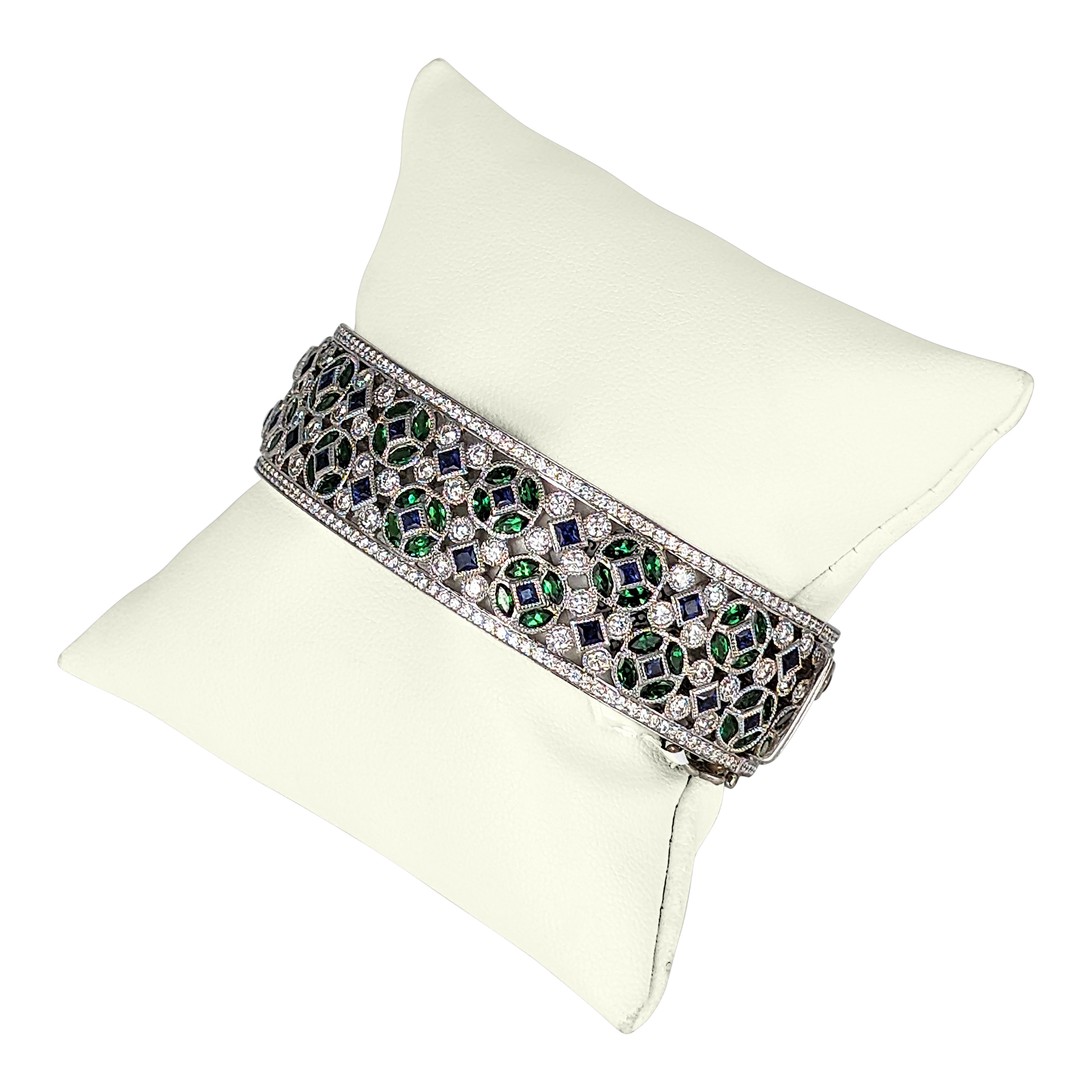 Accentuating the brilliance are 104 marquise-cut emeralds and 52 vibrant blue sapphires, creating a captivating contrast of color and texture. Together, the emeralds and sapphires bring the total gemstone weight to 4.16 carats, turning this bracelet into a radiant mosaic of natural beauty and refined design.