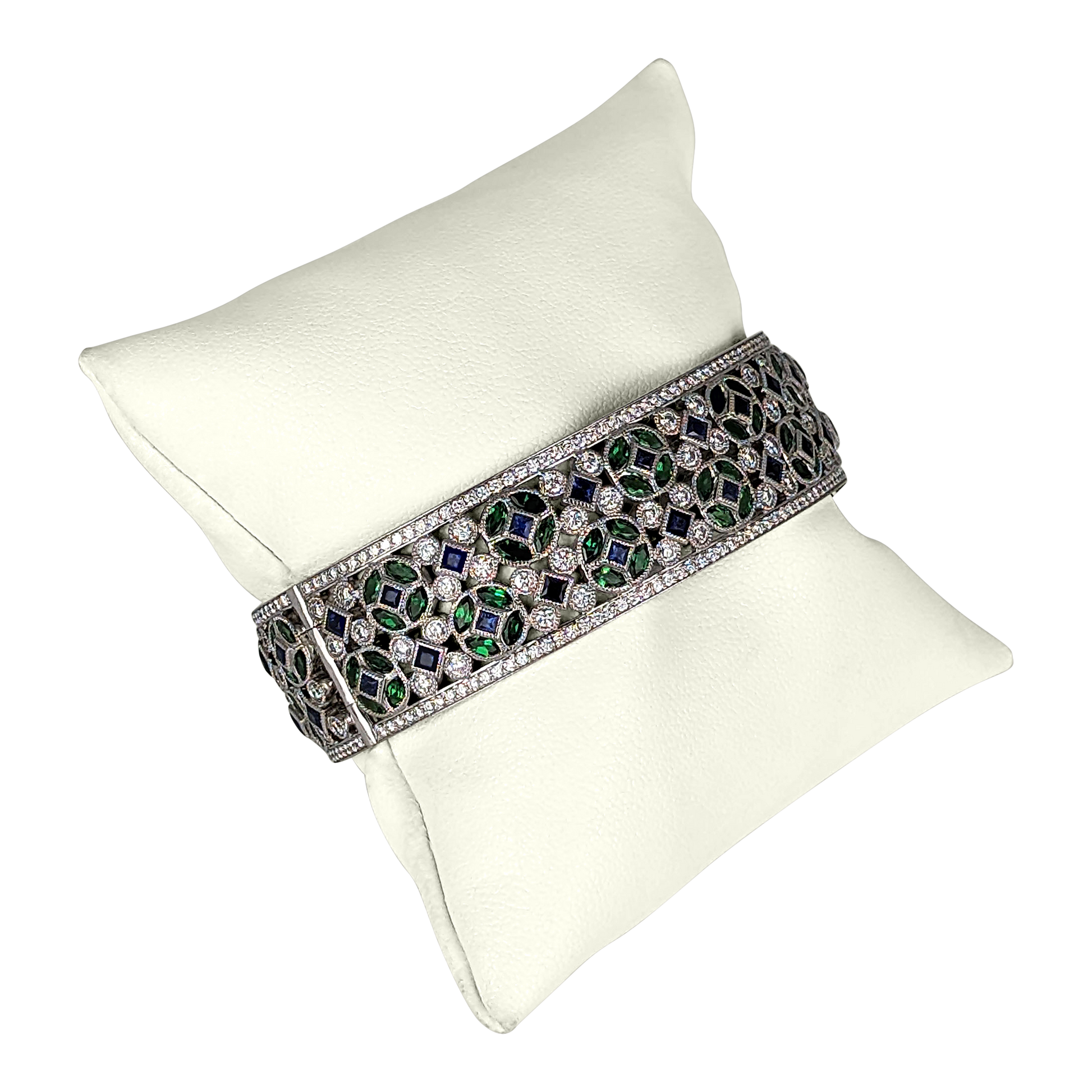Exquisite Multi-Gem Bracelet in 18K White Gold – 5.70 CT Diamonds, 104 Emeralds & 52 Blue Sapphires